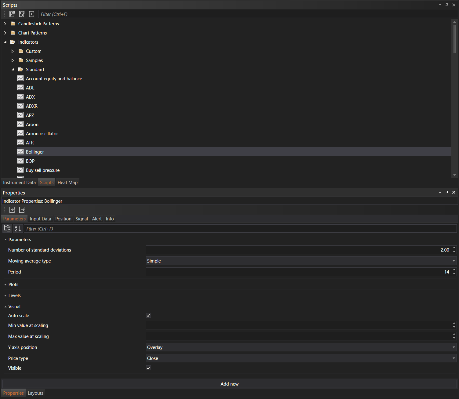 In the Scripts module, indicators can be easily browsed through the organized folder structure. Users can drag and drop these indicators onto their charts for immediate analysis. Clicking on a specific indicator in the Scripts explorer will display its settings in the Properties module, where users can customize the indicator’s parameters according to their trading strategies.