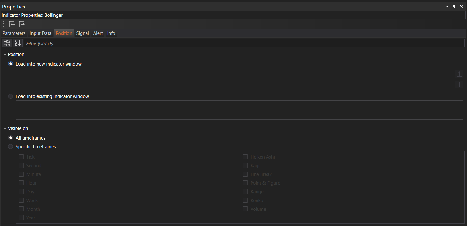 The Position tab within the Properties window of the Indicators in the Scripts module allows users to define the placement and visibility settings for the indicator. This tab provides options for both the position of the indicator and the timeframes on which it will be visible.