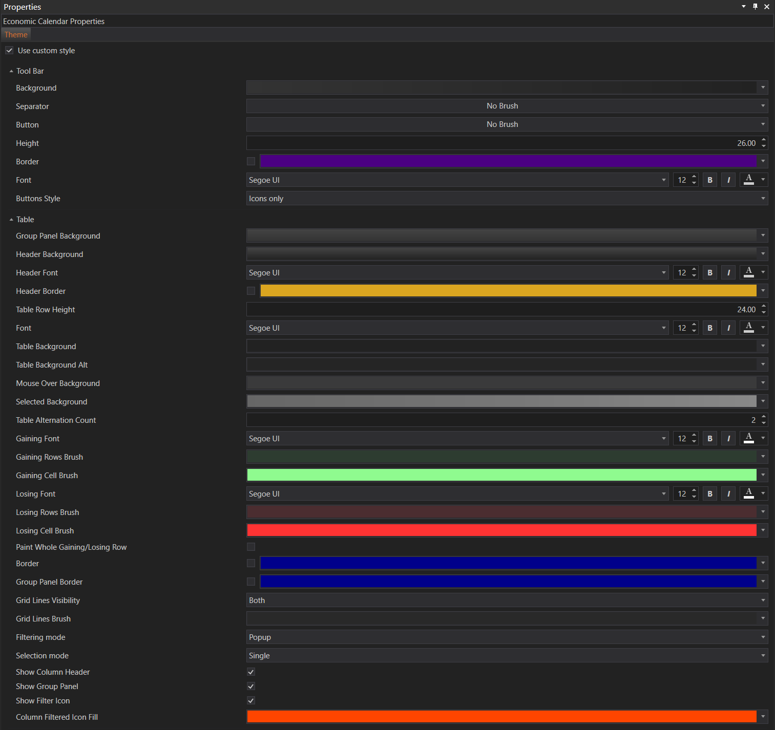 The Properties section for the Economic Calendar module in FinStudio provides extensive customization options through the Theme tab. By adjusting the visual settings for both the toolbar and table, users can create a personalized and efficient interface that enhances the usability of the Economic Calendar. These customization options ensure that users can tailor the module to meet their specific preferences and improve their overall experience.