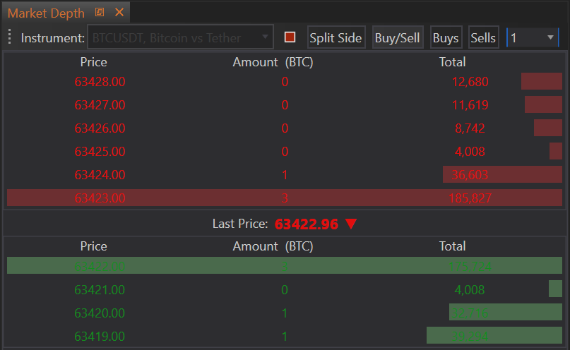 - Utility: This visual arrangement helps traders quickly compare the depth of buying versus selling interest, facilitating decisions based on which side shows more strength or potential resistance and support levels.