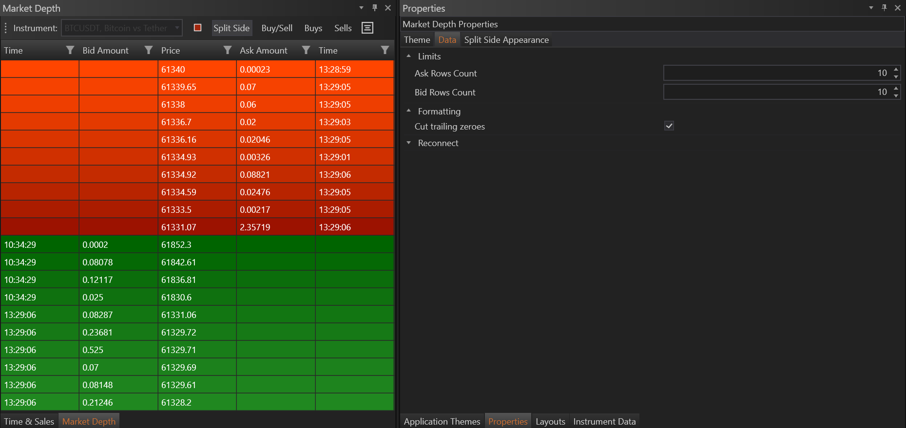 - Tailoring the View: By configuring these properties, traders can optimize the market depth display to match their specific trading preferences and requirements, enhancing both the usability and effectiveness of the tool.