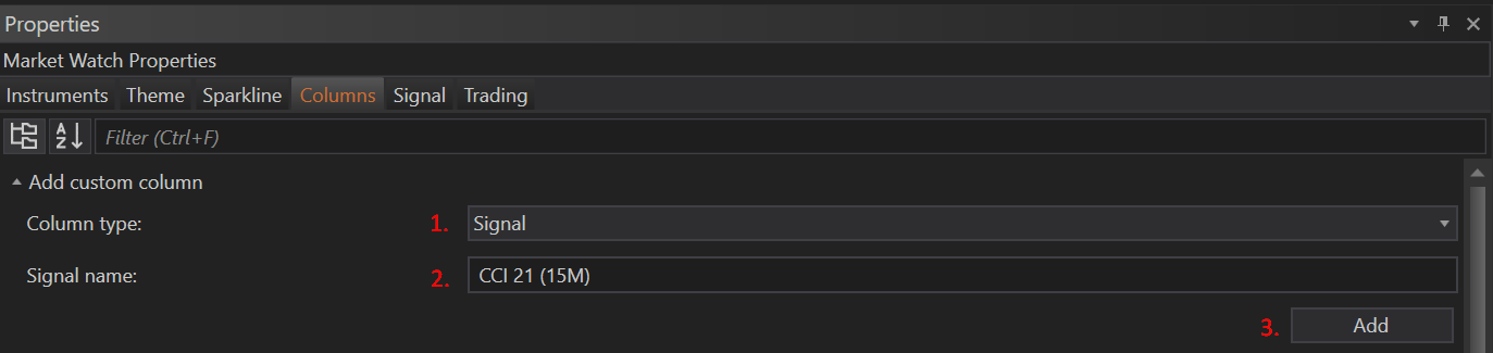 - To integrate a signal column into Market Watch, navigate to the Market Watch Properties and access the Columns tab.