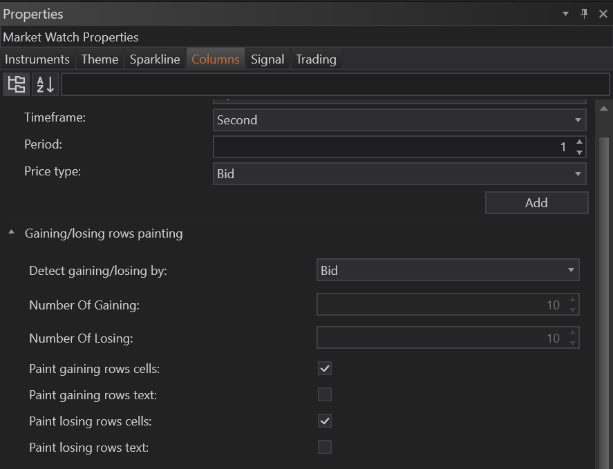 Defining Price Parameters: You can choose which price type—Bid, Ask, Last, or price changes—to base the gaining or losing colors on. This choice depends on what aspect of the market data is most relevant to your trading strategy.