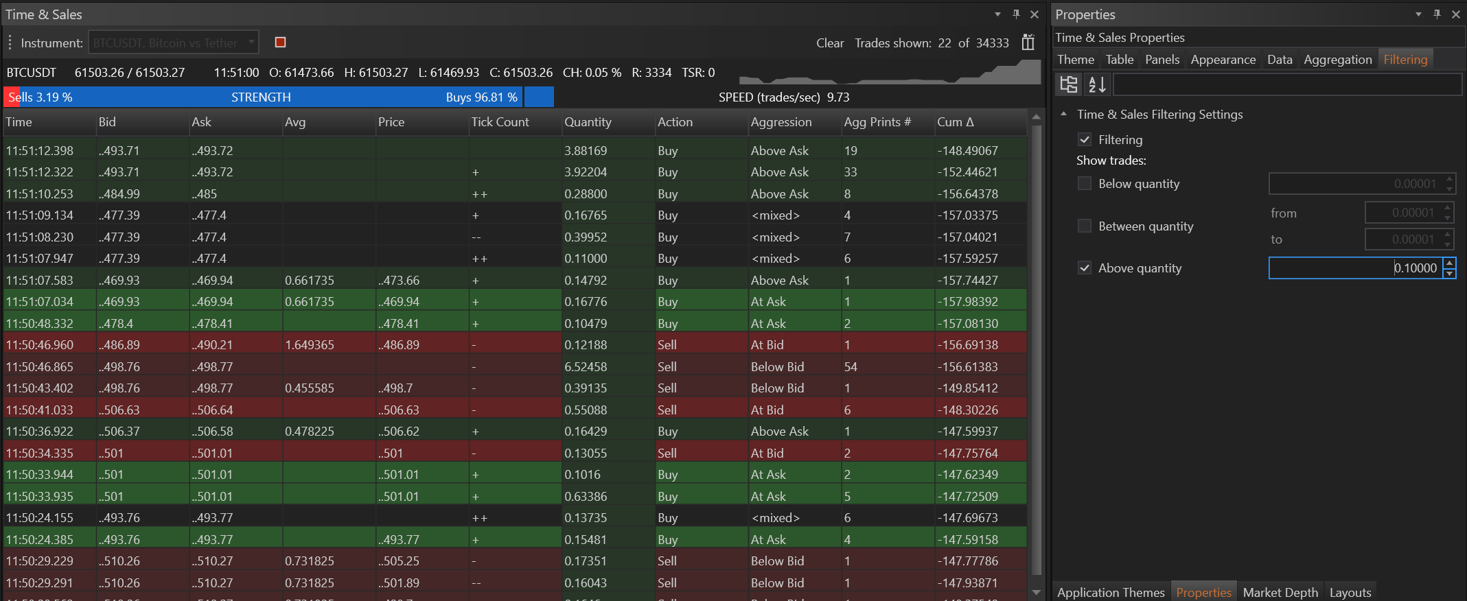 Filtering works alongside aggregation to provide a clearer and more targeted view of market activity, by allowing traders to set thresholds for the trade quantities they are interested in monitoring. This feature is especially useful in fast-moving markets where large volumes of trades occur rapidly.