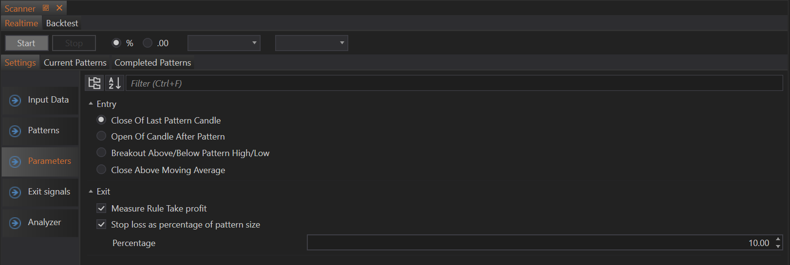 The Parameters section in the Scanner module settings allows users to define the entry and exit conditions for the patterns being scanned. This section is crucial for customizing how the scanner interprets pattern signals and executes trades based on these signals.