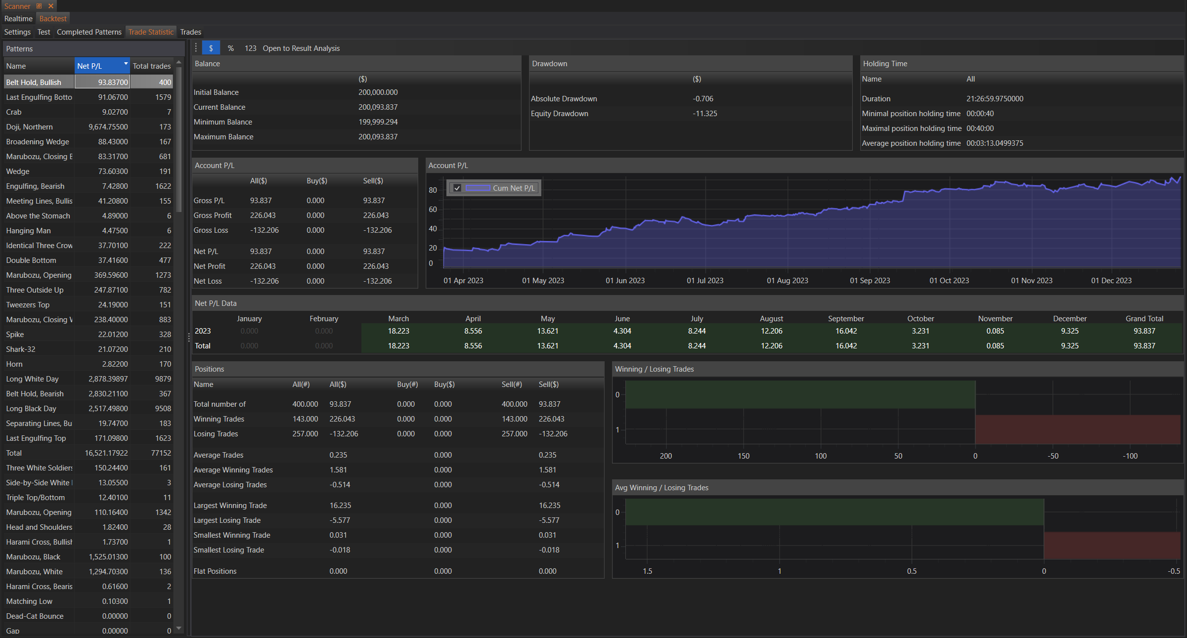 The Trade Statistic module in FinStudio provides a comprehensive analysis of trading patterns and their performance. This module is essential for traders who want to evaluate the effectiveness of various trading patterns and strategies over historical data.