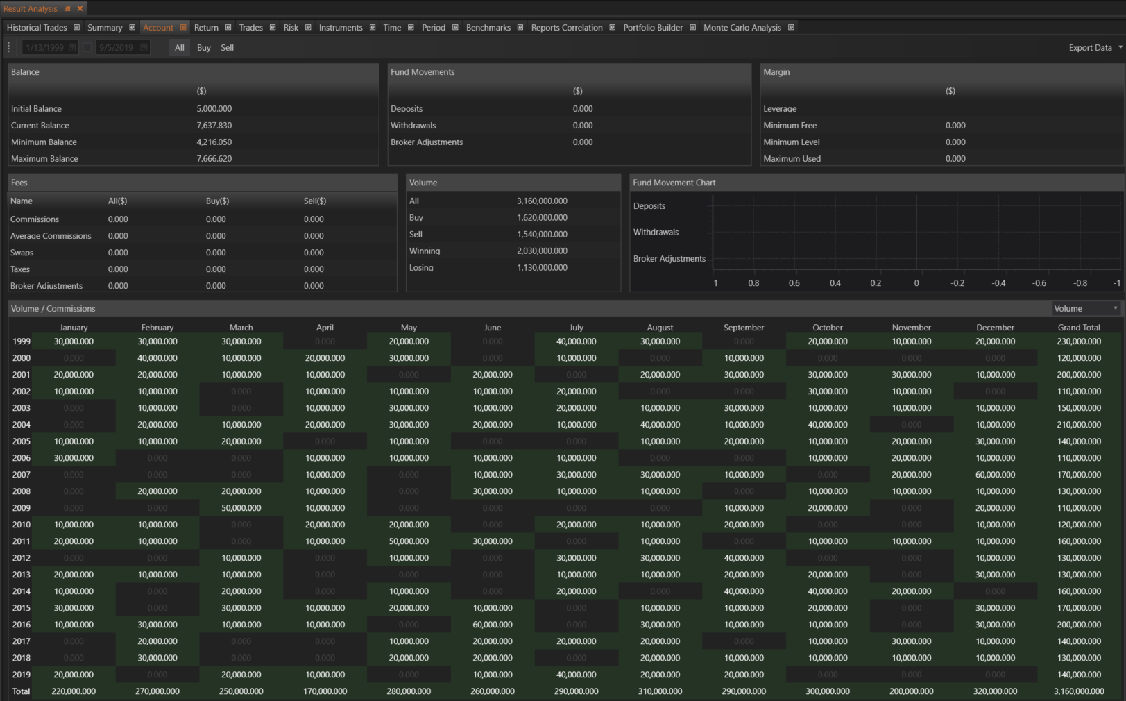 The Account section within the Result Analysis module of FinStudio provides a detailed overview of account-related metrics, including balance changes, fund movements, margin, fees, and trade volumes. This section helps traders understand the financial dynamics of their trading activities and manage their accounts more effectively.