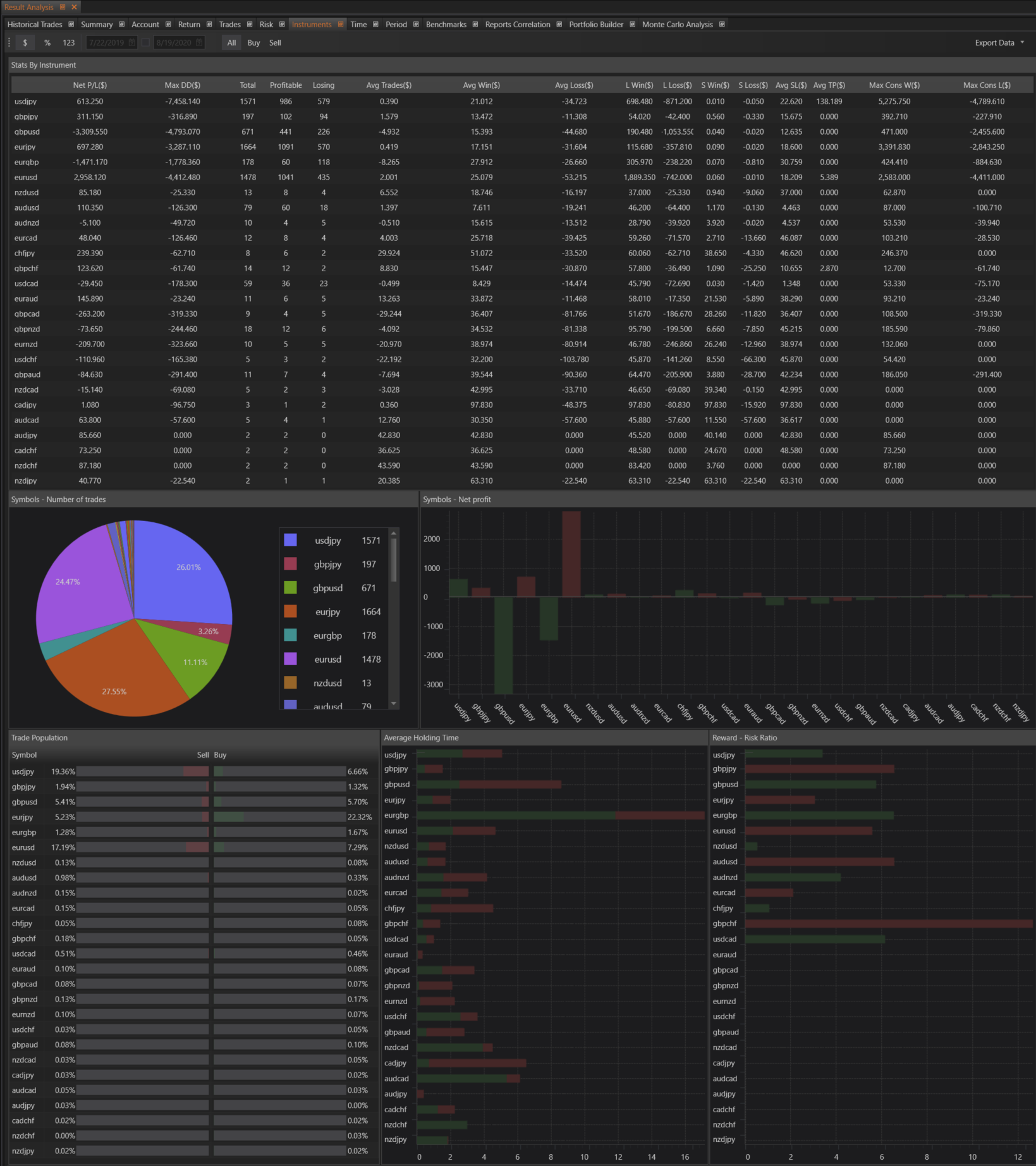 - Trade Population: Graphics illustrating the portion of long and short trades for each instrument, offering a detailed view of trade distribution.