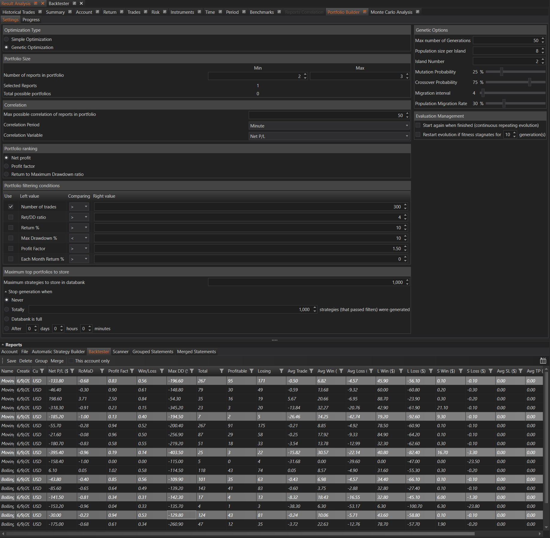 The Portfolio Builder tab in the Result Analysis module is designed to help users create the best possible trading portfolio from their existing reports. By selecting multiple reports, configuring detailed settings, and running the building process, users can construct a portfolio that meets their specific performance and risk criteria. This tool is essential for traders looking to optimize their strategies and achieve their financial goals.