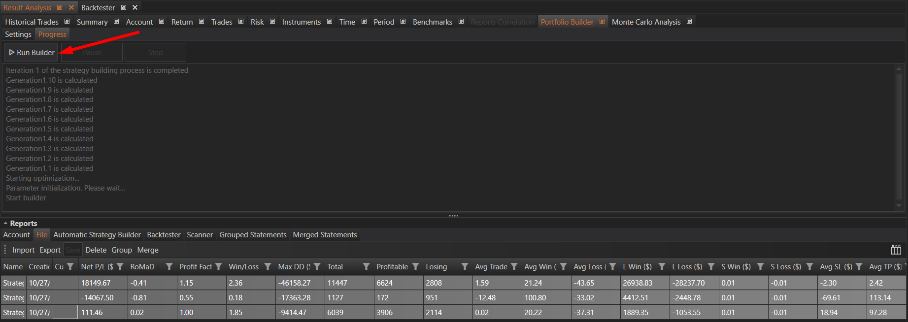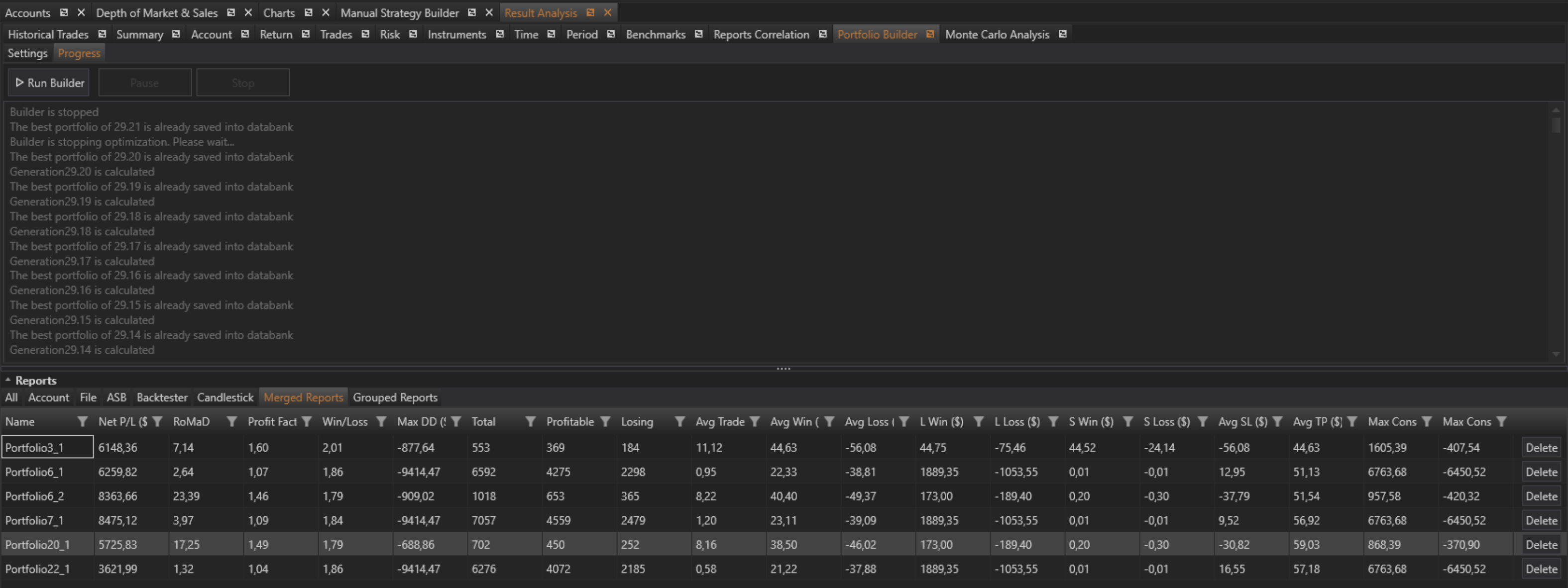 The Progress tab in the Portfolio Builder of the Result Analysis module is the central point for initiating and tracking the portfolio construction process. By following the steps to select reports, configure settings, and launch the builder, users can efficiently create optimized portfolios. The resulting portfolios are stored in the Merged Reports tab, where they can be further analyzed using the comprehensive tools available in the Result Analysis module. This functionality provides traders with the ability to systematically construct and evaluate portfolios, enhancing their decision-making and strategy optimization efforts.