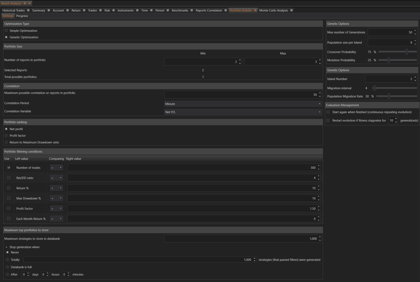 The Settings tab in the Portfolio Builder provides comprehensive controls to tailor the portfolio optimization process. By configuring these settings, users can ensure that the Portfolio Builder operates efficiently, adheres to desired performance criteria, and produces high-quality, diversified portfolios. This flexibility allows traders to fine-tune their strategy optimization to meet specific goals and constraints, ultimately enhancing the effectiveness of their trading decisions.