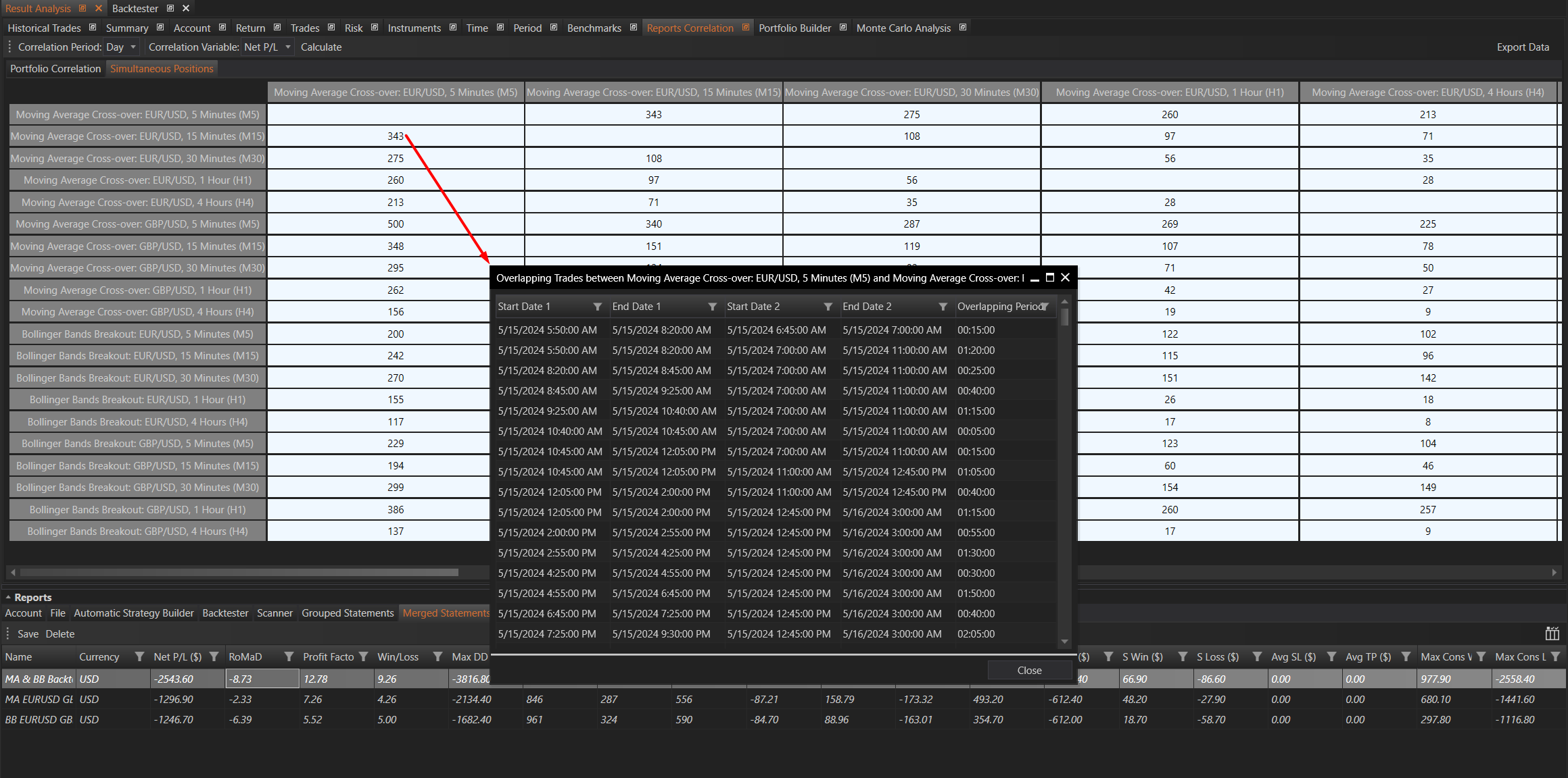 This is a symmetric matrix where each value represents the number of overlapping trades of respective portfolios. Matrix elements have the same properties as elements in the Portfolio Correlation matrix. Clicking on a non-empty element opens a window with data on the overlapping trades, including their overlapping periods.