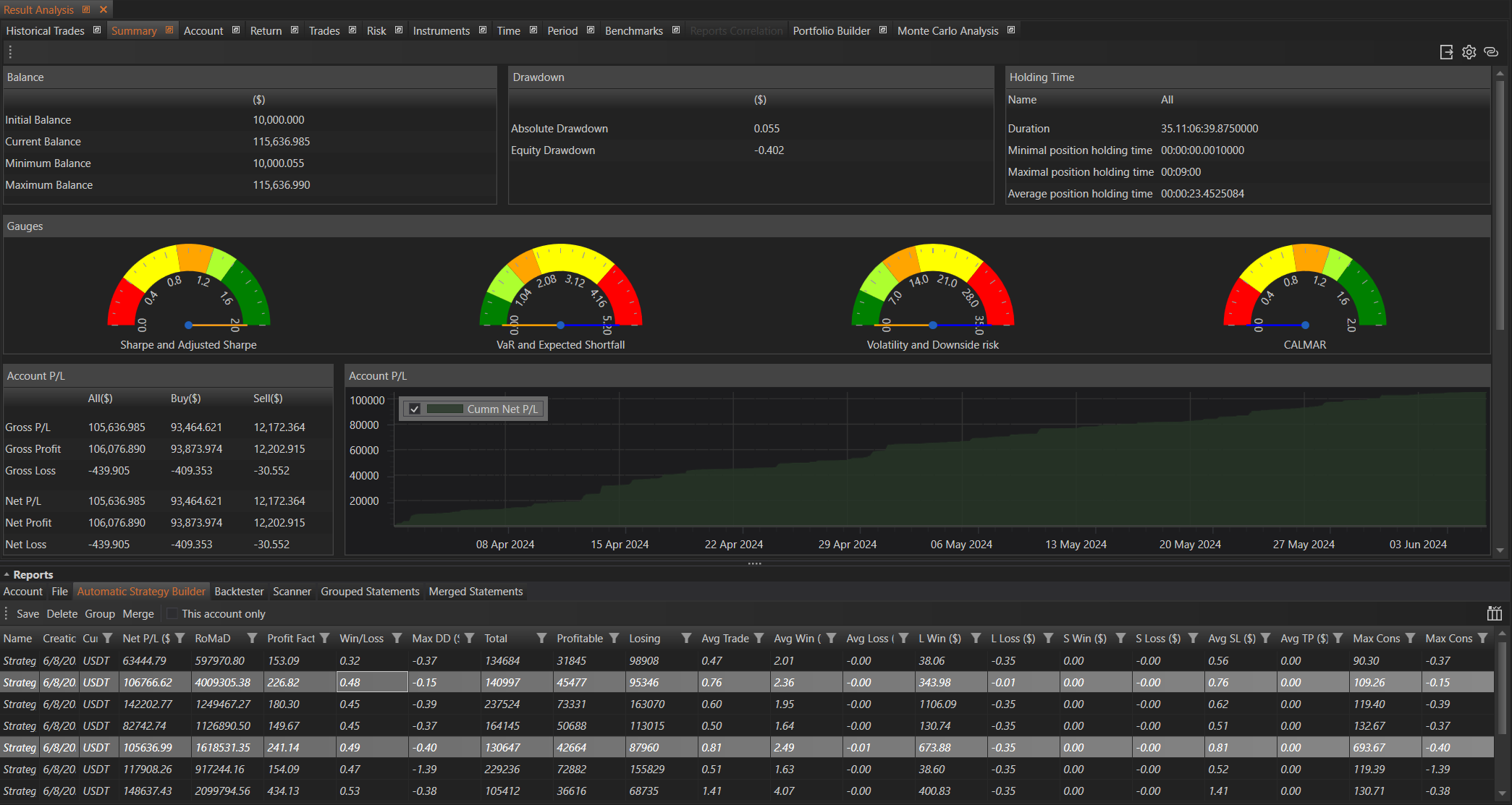The Automatic Strategy Builder tab in the Result Analysis module is a powerful tool for viewing and analyzing the trading history of strategies generated by the ASB. With a range of management features on the toolbar, users can efficiently save, delete, group, and merge reports. The additional columns in the Automatic Strategy Builder Grid provide comprehensive details about each strategy, ensuring users have all the information they need to make informed decisions. By utilizing the "This account only" checkbox, users can filter the strategies to focus on those relevant to the current account, enhancing the analysis and management of trading strategies.