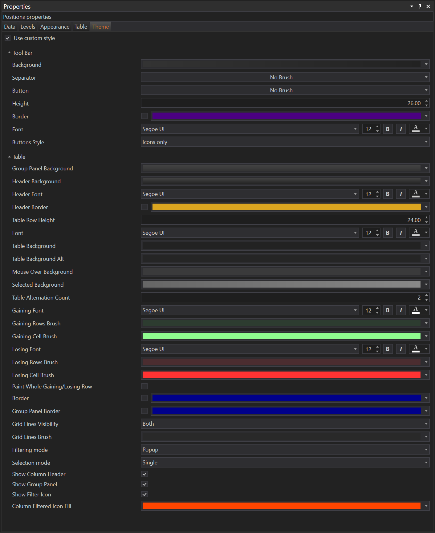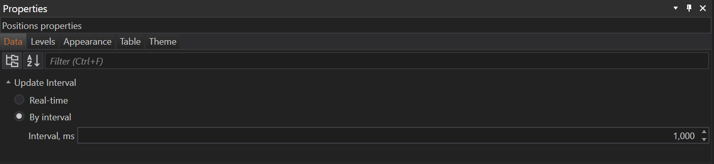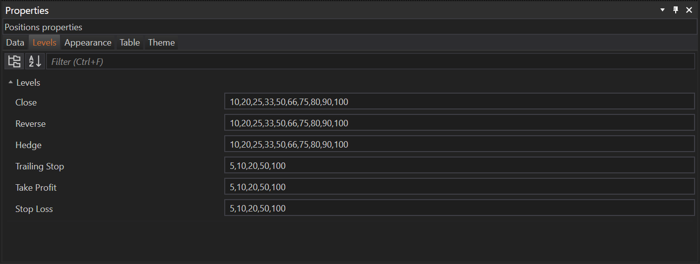 The Positions module in the FinStudio application can be customized through the Properties section. This section is divided into five main tabs: Data, Levels, Appearance, Table, and Theme. Each tab is tailored to enhance the user interface and operational efficiency, allowing for a personalized trading experience.