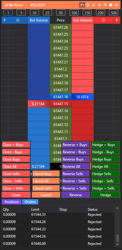 In the FinStudio Tradingboard module, the DoM Panel includes a suite of Order Action Buttons, offering traders robust tools to swiftly manage and modify positions. This section explores the functionality of the Close, Cancel, Reverse, and Hedge buttons, each designed to optimize trading strategies directly from the Depth of Market panel.
