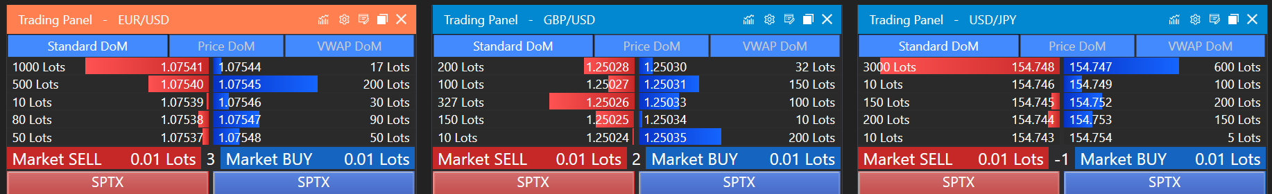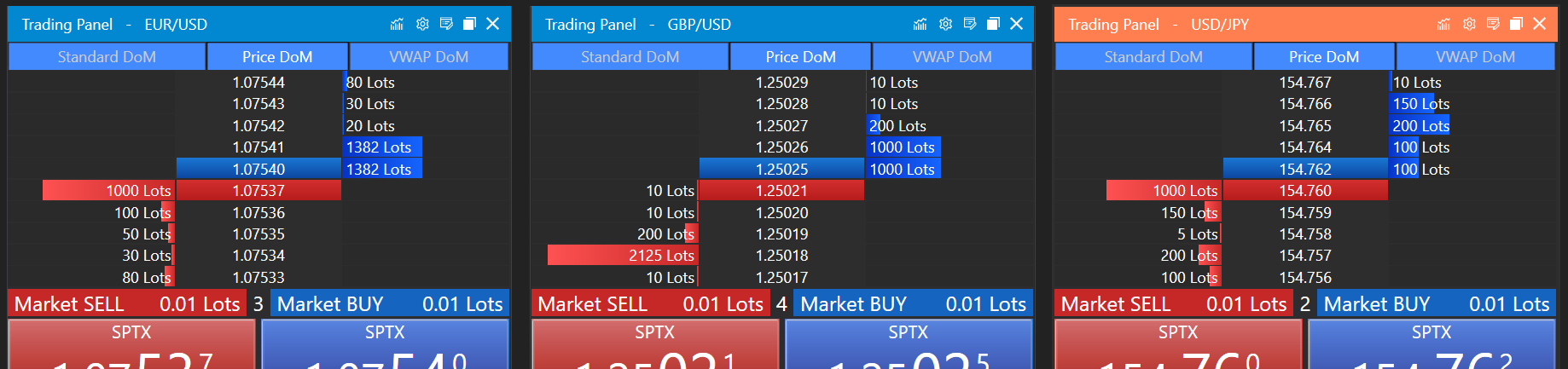 - Functionality: Price levels are displayed in the same row across the panel, allowing traders to easily compare the volume available at each price point. This alignment helps in recognizing liquidity pools and potential price support or resistance areas.