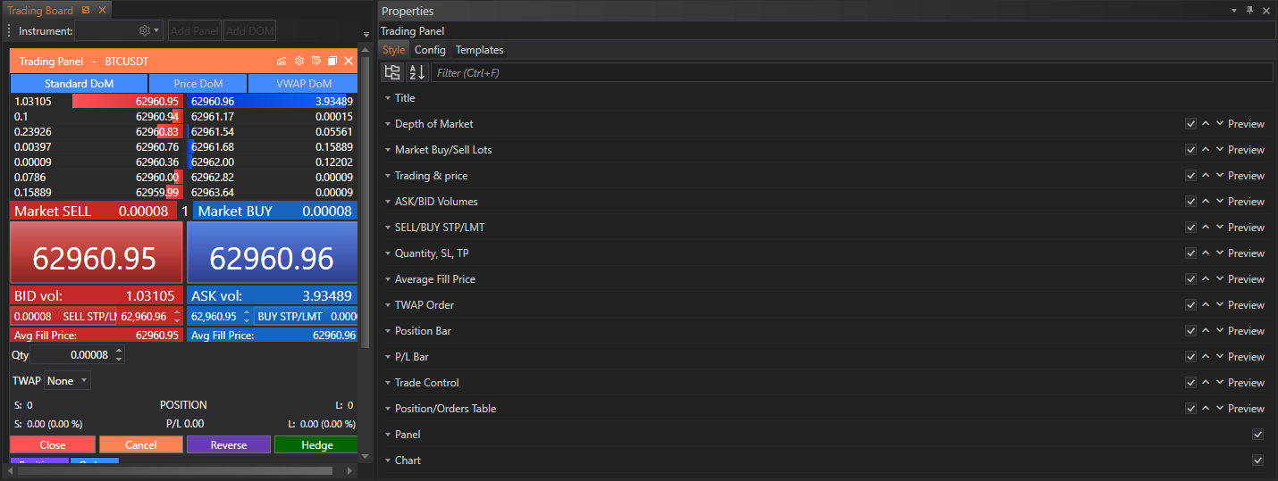 The Style Tab encompasses a variety of settings, each grouped by Trade Panel sections. Here is an outline of the categories and their respective properties: