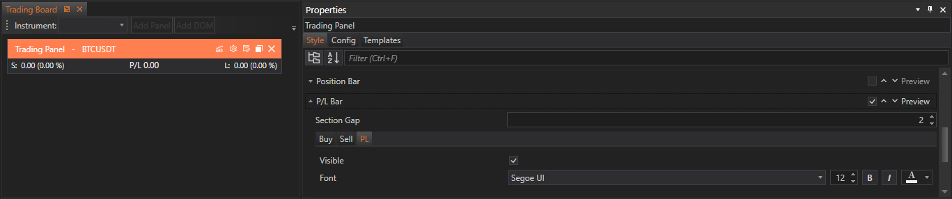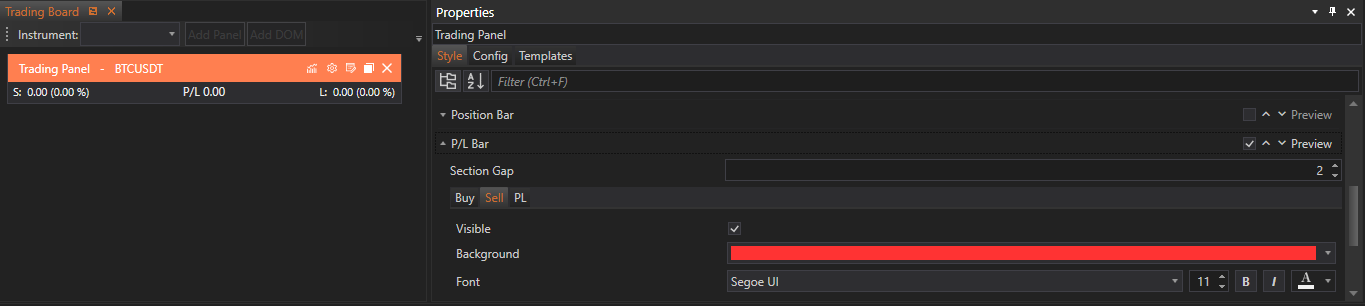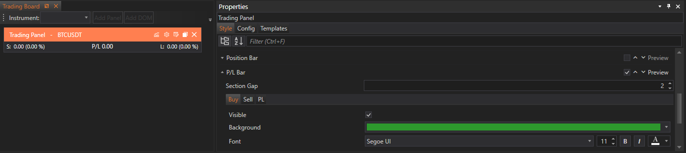 - Traders can adjust the P/L Bar settings by navigating to the respective Buy, Sell, or P/L tabs within the Style Tab. Each tab is clearly organized to focus on its specific set of customization options, facilitating straightforward adjustments.