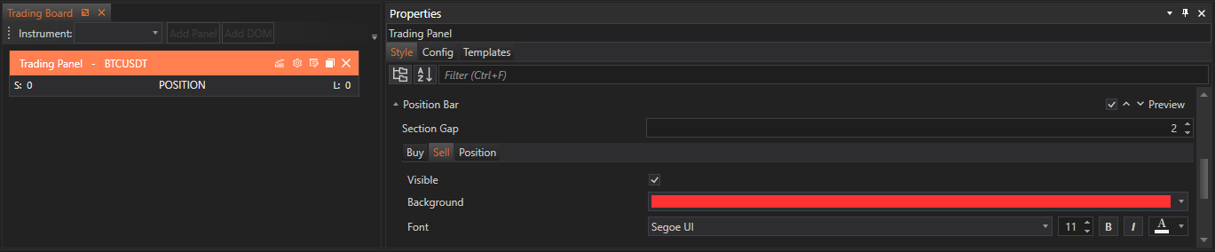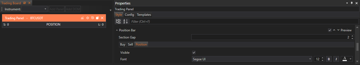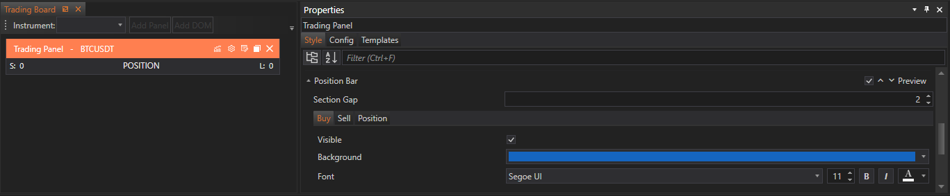 The Position Bar section of the Style Tab in FinStudio's Tradingboard Trade Panel allows traders to customize the visual elements of position indicators for both buying and selling activities. This section is organized into three parts: Buy Tab, Sell Tab, and Position Tab, each designed to offer specific settings that enhance the clarity and functionality of position displays.