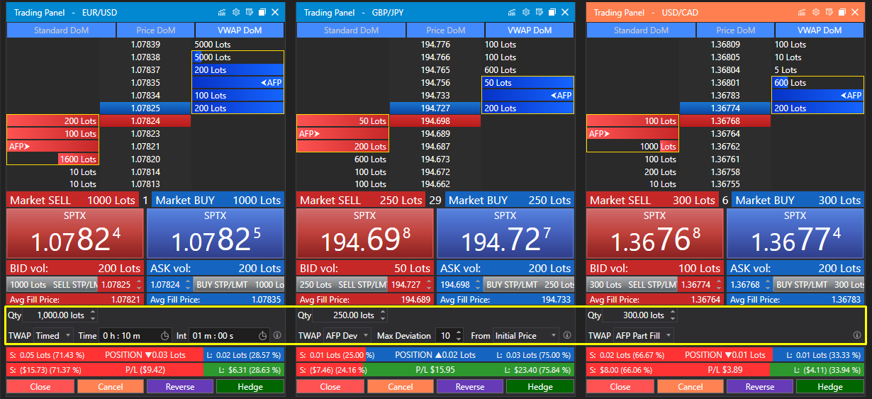 - Functionality: Submits multiple orders with varying quantities based on real-time market conditions and AFP calculations. Each submission adjusts according to the volume available at price levels up to the calculated AFP.