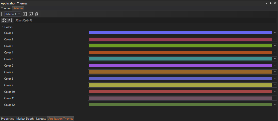 - The Palettes tab provides tools for managing and applying color schemes across the application. This tab simplifies the process of creating and adjusting color palettes, which can then be applied to various elements of the user interface.