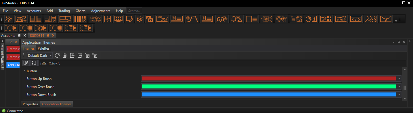 Customizing the Button properties in FinStudio's Application Themes module is key to creating an intuitive and responsive user interface. By carefully adjusting the appearance of buttons across different states, traders can enhance both the visual appeal and the functional efficiency of their trading platform. These settings not only improve the aesthetic quality of the interface but also support effective user interactions, which are essential in high-stakes trading environments.