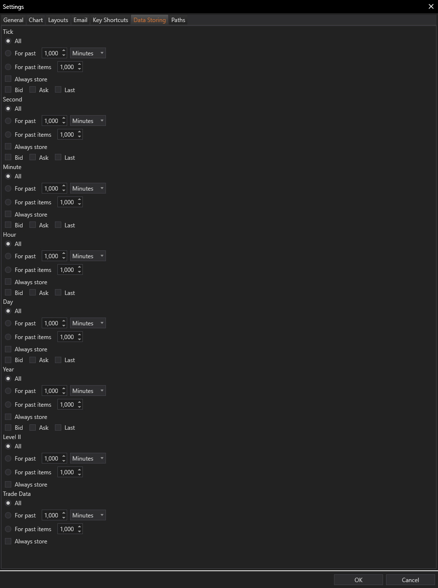 The Data Storing settings allow users to fine-tune what data is collected, how it's stored, and the period for which it is retained. These settings are designed to cater to the diverse needs of traders, ranging from those requiring extensive historical records to those needing immediate, short-term data access.